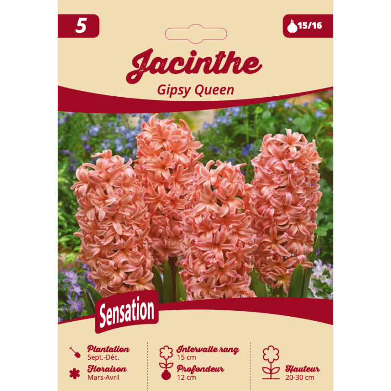La jacinthe Gipsy Queen est une variété de jacinthe au coloris aléatoire pouvant être corail, rose pâle ou bien rose orangé. Elle produit de beaux épis bien denses dont se dégage un parfum envoutant. La jacinthe Gipsy Queen produit de belles fleurs en forme d'étoiles.