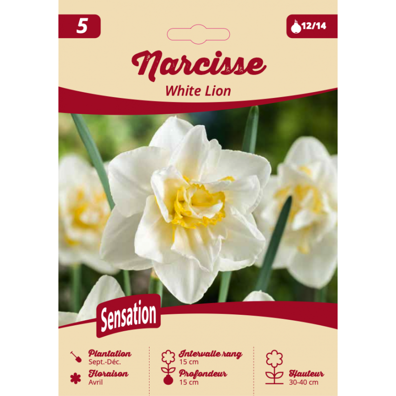 Les narcisses White Lion est une variété de bulbe d'automne produisant de très belles fleurs de 10 cm de diamètre, de couleur ivoire au coeur jaune. Au cours de son développement les narcisses White Lion peuvent atteindre 45 cm de haut.