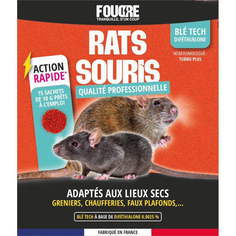 Le TURBO PLUS – Blé TECH Rats & Souris Cides est un appât rodenticide professionnel prêt à l’emploi, spécialement formulé pour lutter efficacement contre les rats (Rattus norvegicus, Rattus rattus) et les souris (Mus musculus).